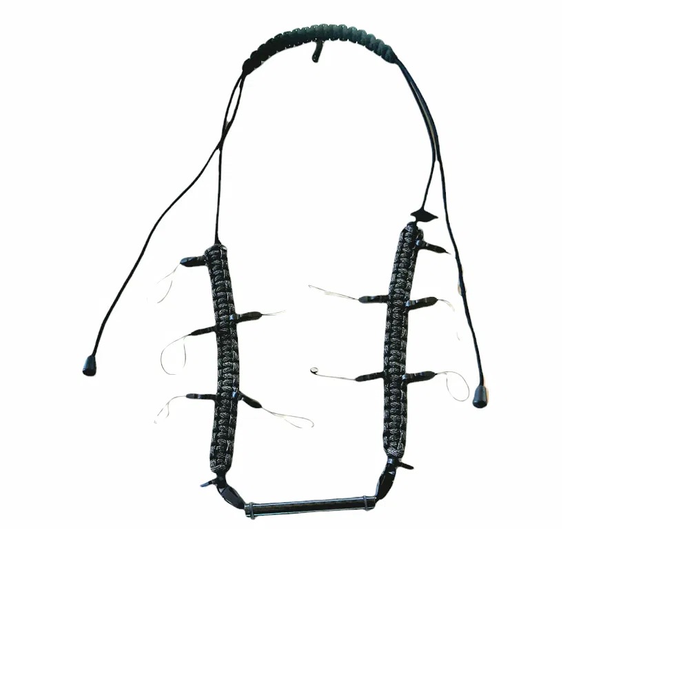 ON GARDE LE MEILLEUR DE COLLIER AUDE POUR DEVENIR LE COLLIER CARCANET. ON LUI REMPLACE LES MOUSQUETONS EN MÉTAL PAR DES BOUCLES DETACHABLES NOIRES SANS REFLETS BRILLANTS ET PLUS LÉGÈRES SANS NÉGLIGER LA SOLIDITÉ. ET POUR TERMINER ON RAJOUTE UN ANNEAU POUR PENDRE L’ÉPUISETTE. 100% PARACORDE US COULEUR FUSION GRIS ET NOIR. 10 BOUCLES DETACHABLES NOIRES 1 PORTE BOBINES CARBONE DIMENSIONS: 100X10mm LE COLLIER EST PRÉVU POUR LE JOUR OU VOUS SOUHAITEZ RAJOUTER LA DORSALE.